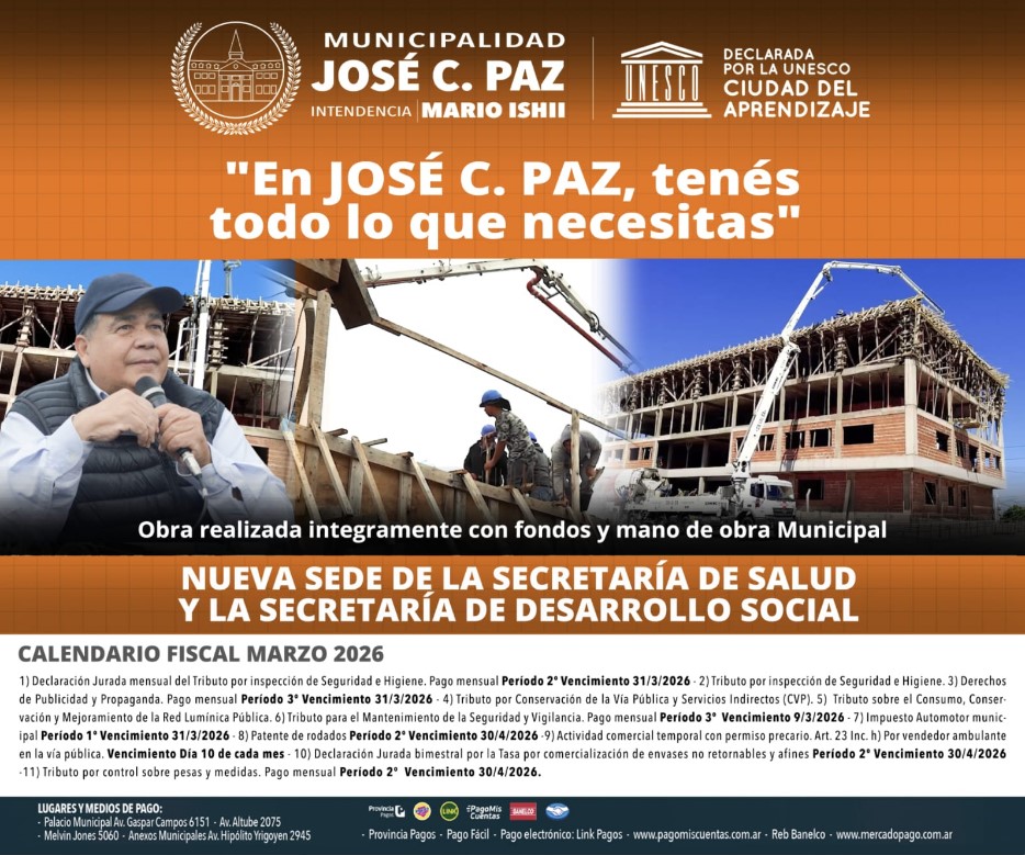 José C. Paz: Con un fuerte llamado a la unidad y la educación, el municipio inició su ciclo legislativo 2026. Merlo: Cursos gratuitos para jóvenes del municipio. Escobar: Llega una nueva edición de “Garín Corre”: deporte, música y recreación para toda la familia. José C. Paz: El municipio continúa con los operativos de emprolijamiento para las calles y espacios verdes del distrito. Merlo: Patio folklorico merlense. San Isidro: Capacitan a 60 nuevos agentes para reforzar la Patrulla Municipal y el sistema de prevención. Morón: El municipio abre la convocatoria para incorporarse a la policia municipal. José C. Paz: Se sigue mejorando las calles del distrito. Escobar: Acompañamiento y articulación con la Justicia para la adopción de una niña de 14 años. Tres de Febrero: El municipio recupera la antigua estación de Lourdes que estaba tomada. Tres de Febrero: «Vamos a continuar por el camino de menos impuestos, más trabajo». Ituzaingó: Más de 1900 personas disfrutaron de las colonias de verano. Merlo: Talleres culturales anuales gratuitos 2026. Morón: «El futuro es mejor cuando el estado está cerca de la gente». Gral. Rodríguez: Comenzaron las clases en la casa de la niñez "Libertad Lamarque". José C. Paz: Evaluación para aspirantes a bomberos en el hospital de salud mental y de adicciones en el municipio. José C. Paz: El municipio cerró el verano 2026 en el mercado concentrador. José C. Paz: Mario Ishii inauguró la quinta escuela técnica del municipio.
